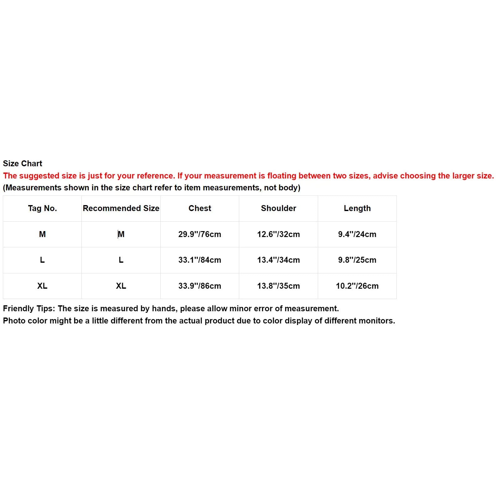 | Tag-Nr. | Empfohlene Größe | Brust | Schulter | Länge |